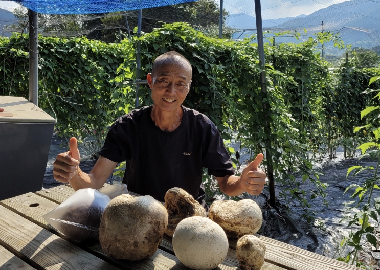 이번에는 총 7개의 댕구알버섯이 발견됐으며 가장 큰 버섯은 볼링공 크기만 하다. 유기농 24년차 이장님의 노력속에서 결실이 피었다.