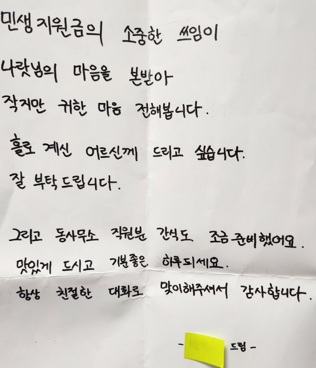 ![]() 익명의 기부, 민생회복 소비쿠폰으로 백미·간식 기탁 ‘손 편지 |