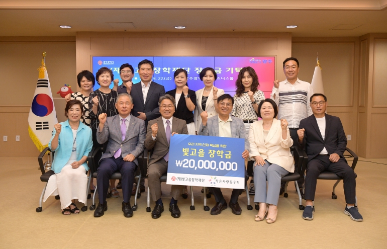 이날 시청 비즈니스룸에서 열린 장학금 기탁식에는 빛고을장학재단 이사장인 강기정 시장을 비롯해 작은사랑동우회 김승휘 회장과 회원 등 20여명이 참석했다.
