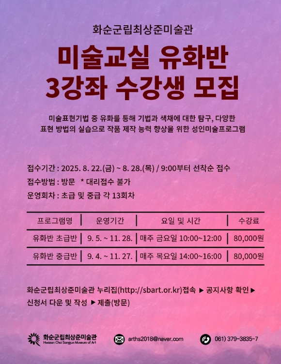 신청서는 화순군립최상준미술관 누리집 공지 사항에 게시되어 있으며, 수강 신청서를 내려받아 작성 후 8월 22일 신청 당일 오전 9시부터 화순군립최상준미술관(화순읍 진각로 249-8)에 선착순으로 방문·접수하면 된다.