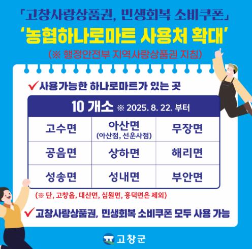이번 추가 등록되는 하나로마트 10개소에서 고창사랑상품권 뿐만 아니라 민생회복 소비쿠폰도 함께 사용이 가능하다.
