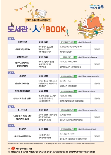 자세한 내용은 광주광역시대표도서관 누리집이나 무등도서관 관리과로 문의하면 된다. 신청은 각 운영도서관 누리집으로 개별 신청이 가능하다.