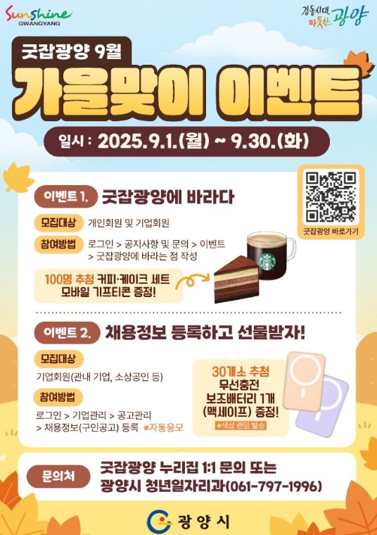 ![]() ‘굿잡광양’ 9월 가을맞이 풍성한 참여 이벤트 마련 |