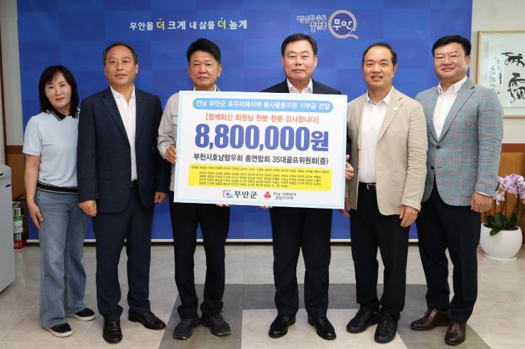 이날 기탁식은 김산 군수, 안병일 부천시 호남향우회 총연합회 35대 골프위원장 및 임원진 등이 참석한 가운데 진행됐으며, 이번 성금은 갑작스러운 집중호우로 어려움을 겪은 무안군 지역의 주민들에게 따뜻한 위로의 마음을 전하기 위해 회원들의 정성을 모아 마련됐다.