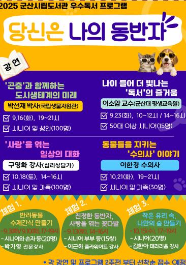 9월 3일 ‘반려동물 수제간식 만들기’로 프로그램을 시작하는 시립도서관은 이어 ▲박선재 국립생물자원관 박사의 ‘곤충과 함께하는 도시생태계의 미래’ 강연 ▲이소암 교수의 ‘나이 들어 더 빛나는 독서의 즐거움’ 강연 ▲진정한 부부를 위한 꽃다발 만들기 체험이 이어진다.
