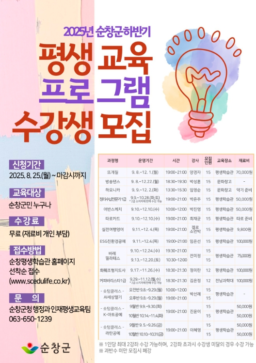 ![]() 순창군,‘하반기 평생교육 프로그램’수강생 모집 |