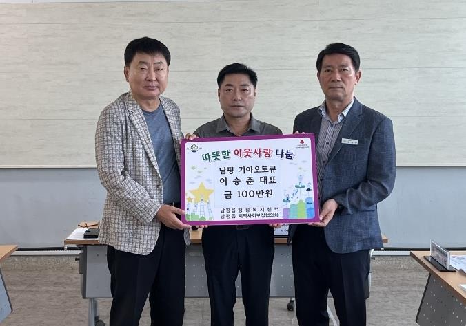 ![]() 나주시 남평 기아오토규 이승준 대표(가운데)가 남평읍 지역사회보장협의체에 이웃사랑 실천 후원금을 기탁했다. (사진 제공-나주시) |