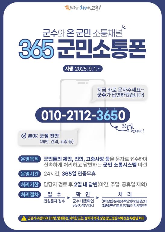 '365 군민소통폰'은 군민 누구나 언제 어디서나 자유롭게 문자메시지를 통해 군정 정책에 대한 제안이나 건의, 생활 속 고충사항 등을 전송하면, 군수가 직접 내용을 확인하고 해당 부서에 검토 및 조치를 지시, 2일 이내 문자로 답변하는 24시간 상시 소통 시스템이다.