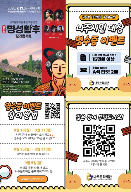 김찬동 나주문화재단 대표이사는 “영수증 이벤트에 대한 시민들의 큰 성원에 힘입어 좌석을 두 배로 확대했다”며 “시민들이 체감할 수 있는 문화 향유 기회를 넓히고 지역 경제에도 활력을 불어넣는 다양한 프로그램을 마련하겠다”고 말했다.