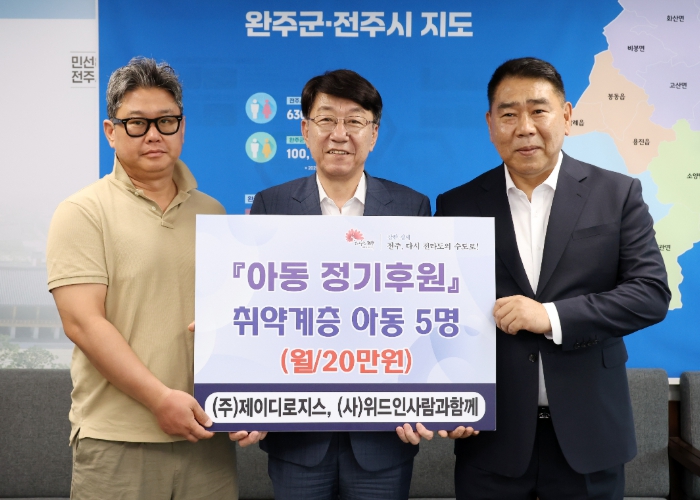 전주시와 ㈜제이디로지스, 사단법인 위드인 사람과함께는 27일 전주시장실에서 우범기 전주시장과 이상욱 ㈜제이디로지스 대표, 유서진 위드인 사람과함께 이사장 등이 참석한 가운데 취약계층 아동을 위한 후원 협약식을 가졌다.