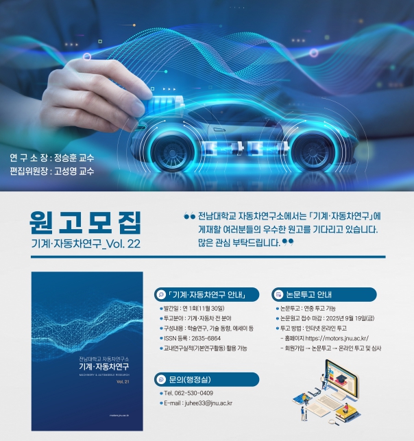 전남대 자동차연구소 관계자는 “기계 및 자동차 분야의 우수한 연구 성과와 기술 동향을 담아 학계와 산업계 발전에 기여하고자 한다”며 “많은 연구자의 관심과 적극적인 투고를 기대한다”고 밝혔다.