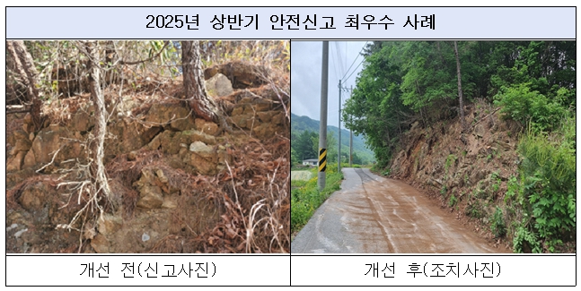 올해 상반기 최우수 사례는 장수군 도로 급경사지에서 법면 낙석 및 붕괴 위험을 발견해 나무 제거를 제안한 사례이다. 해당 신고를 바탕으로 폭우 및 강풍 시 발생할 수 있는 붕괴를 예방했다.