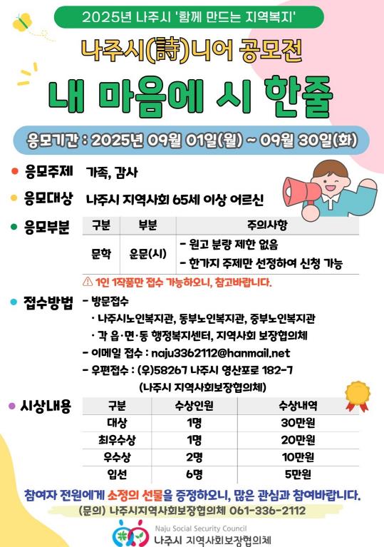 ![]() ‘2025년 나주시(詩)니어 제1회 내 마음에 시 한 줄 공모전’ 홍보 포스터. |