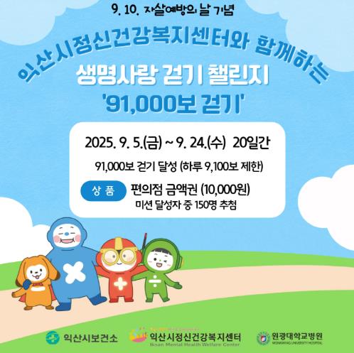 ![]() 익산시, 자살예방의 날 맞아 생명사랑 걷기챌린지 |