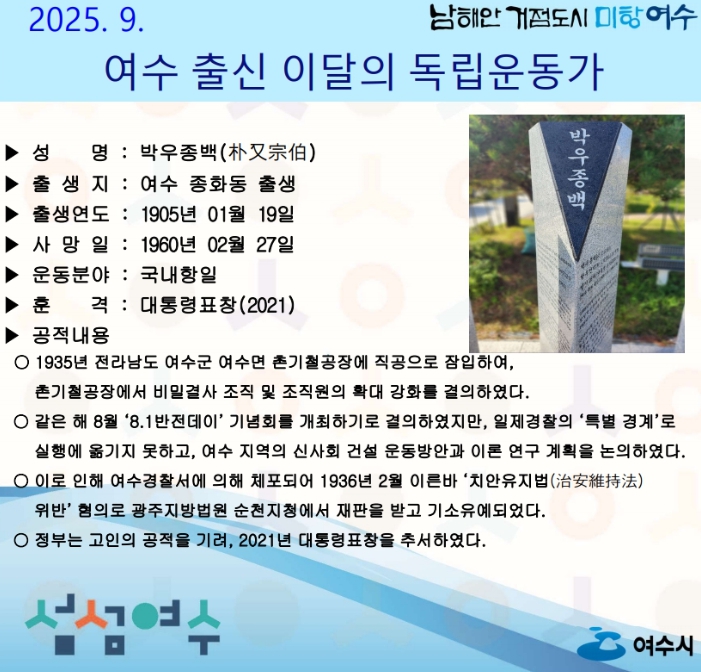 ![]() 전라남도 여수 종화동 출신의 ‘박우종백(朴又宗伯)’ 선생을 2025년 9월의 독립운동가로 선정했다. |