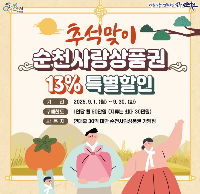 ![]() 추석맞이 순천사랑상품권 13% 할인판매 |