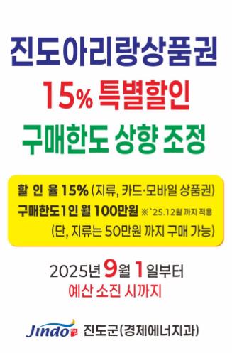 ![]() 진도아리랑상품권 15% 특별 할인! 12월까지 구매 한도 상향 |