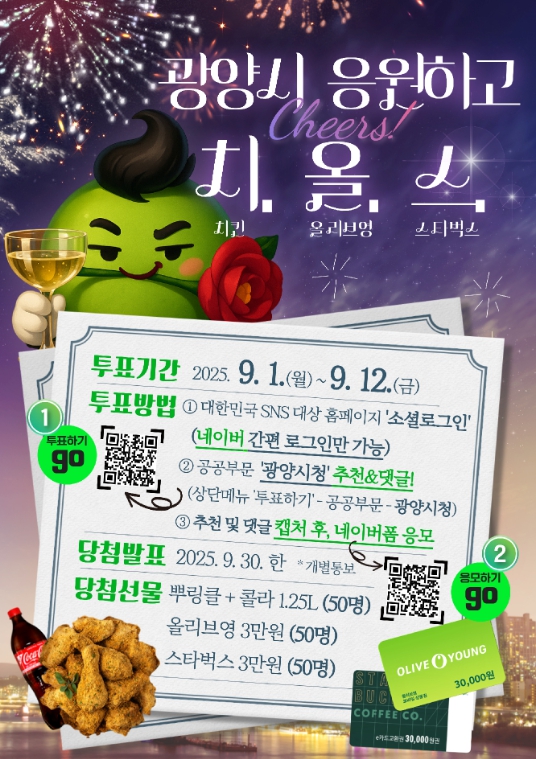 올해 투표 기간은 9월 1일부터 12일까지이며, 시는 누구나 쉽게 참여할 수 있는 온라인 이벤트 ‘광양시 응원(Cheer)하고 치. 올. 스.!(Cheers!)’로 참여율을 높일 계획이다.