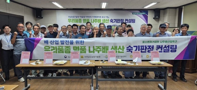 ![]() 나주시가 고품질 나주배 생산을 위해 농가에 수확 시기를 알리고 적기 수확을 유도하고 있다. 사진은 지난달 22일에 진행한 나주배 생산 숙기판정 컨설팅 기념 단체사진 |