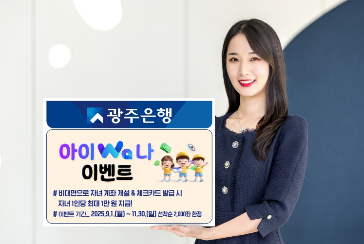 ![]() 광주은행, 자녀 통장·체크카드 만들면 용돈 받는 ‘아이Wa나 이벤트’ 시행 |