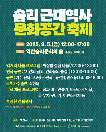 익산시 관계자는 "이번 축제는 주민들이 직접 참여하고 준비한 프로그램으로 더욱 뜻깊다"며 "인화동 근대역사 지구의 가치를 시민과 나누고, 도시재생 성과를 함께 즐기는 계기가 되길 바란다"고 말했다.