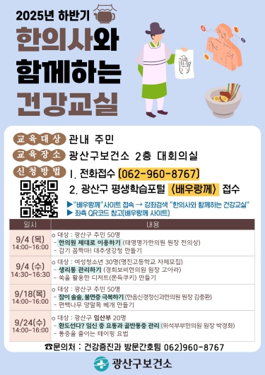 한의사와 함께하는 건강교실은 광산구 평생학습포털(배우랑께) 또는 전화로 신청할 수 있으며, 자세한 내용은 광산구 건강증진과로 문의하면 된다.