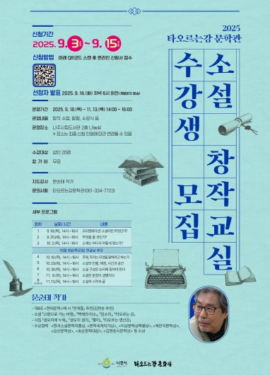 대하소설 타오르는 강(전 9권)의 저자이자 한국소설문학작품상, 이상문학상 특별상, 채만식문학상 등 국내 주요 문학상을 받은 문순태 작가가 강사로 나서 수강생들과 깊이 있는 문학적 경험을 나눌 예정이다.