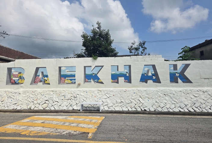 백학마을 주민들은 간척 이전 바닷물이 들어와 학이 노닐던 아름다운 마을 모습을 떠올리며 마을 경로당 앞의 노후 벽면에 ‘BAEKHAK’이라는 마을 이름을 담은 벽화 포토존을 만들었다.