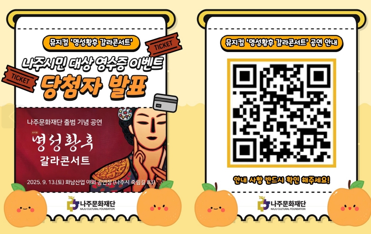 김찬동 나주문화재단 대표이사는 “무료 좌석 이벤트에 보내주신 시민들의 열띤 관심에 감사드린다”며 “안전하고 쾌적한 공연 관람을 위해 사전에 반드시 공연장 위치와 주차 안내를 확인해 주시길 바란다”고 당부했다.