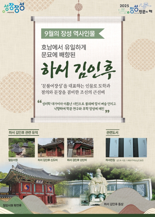 김한종 장성군수는 “충의를 중시 여긴 하서 선생의 가르침은 오늘날 우리들에게 큰 울림을 전한다”며 “9월의 장성 역사 인물로 선정해 선생을 기리고, 가치 있는 삶에 대해 함께 생각해 보는 시간을 갖고자 한다”고 말했다.