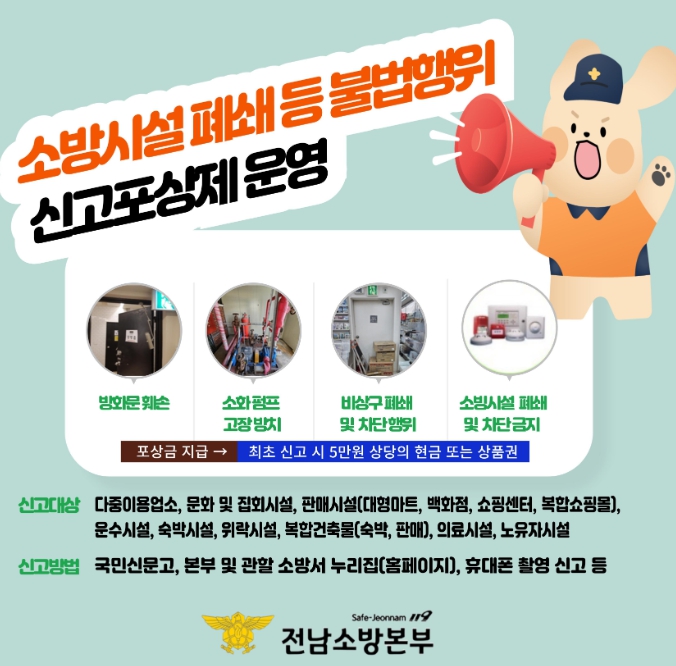 나주소방서 관계자는 “신고포상제를 통해 비상구 폐쇄·소방시설 차단 행위를 근절하고 가족, 이웃의 소중한 생명을 지킬 수 있도록 적극 동참해 주길 바란다”고 말했다.