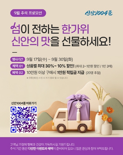 ![]() 신안군, 추석맞이 ‘신안1004몰’ 특별 기획전 개최…지역 농수특산품 최대 30% 할인 |