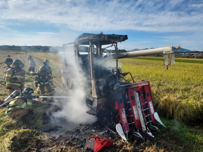 소방본부가 최근 10년간 도내에서 발생한 농기계 화재 207건을 분석한 결과, 이 시기에만 80건이 발생해 전체의 38.6%를 차지했다. 이어 봄철 69건(33.3%), 여름철 43건(20.8%), 겨울철 15건(7.3%) 순으로 나타났다. 특히 콤바인 화재가 45건으로 절반 이상을 차지했으며, 트랙터 17건, 베일러 5건 순으로 집계됐다.