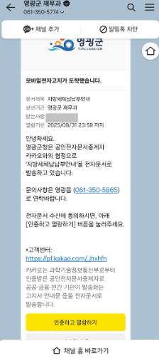 ![]() 영광군, 체납지방세 카톡 전송으로 징수 효과 ‘톡톡’ |
