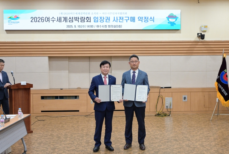 ![]() (재)2026여수세계섬박람회조직위원회는 지난 10일 여수시주민자치협의회와 2026여수세계섬박람회 입장권 2,400매 사전 구매약정을 체결했다. |