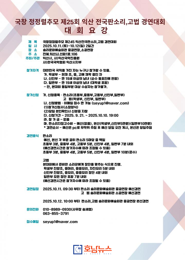 An Iksan City official stated, “As the competition marks its 25th year, it will serve as an important occasion to reflect on the roots of traditional pansori and to provide younger generations with a valuable opportunity to experience the true essence of Korean traditional music. We will continue to support efforts to preserve and pass down this cultural heritage.”