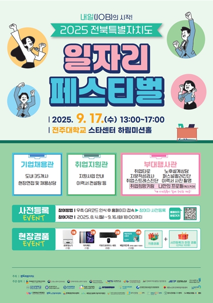 도는 오는 9월 17일 전주대학교 스타센터 하림미션홀에서 '2025 전북특별자치도 일자리페스티벌'을 개최한다고 밝혔다. 이번 행사는 구직자에게는 양질의 일자리를, 기업에는 우수 인재를 발굴할 기회를 제공하는 뜻깊은 자리로 마련됐다.