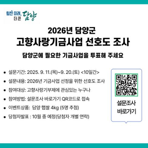 정철원 담양군수는 “담양을 사랑하는 마음으로 보내주신 소중한 기부금이 군민들의 삶에 도움이 될 수 있도록 기부자와 군민의 다양한 의견을 기금사업에 반영하겠다”며 “이번 설문조사에 많은 관심과 참여를 부탁드린다”고 말했다.