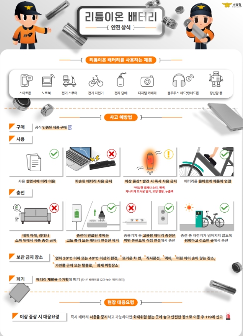 이에 소방서는 ▲정품 충전기 사용과 과충전 방지 ▲배터리를 안전한 곳에 보관 및 징후를 사전에 점검 ▲화재 발생 시 대피를 우선 ▲배터리 폐기 시 전용 수거함을 이용 등의 안전수칙 준수를 당부했다.