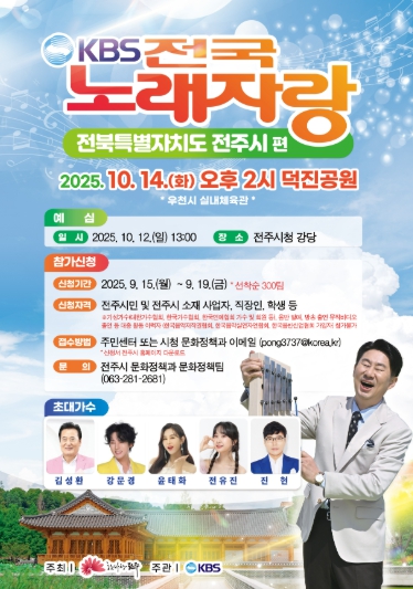 전주시는 오는 10월 14일 오후 2시, 덕진공원에서 온 국민의 사랑을 받아온 KBS ‘전국노래자랑’ 전북특별자치도 전주시편이 개최된다고 12일 밝혔다.