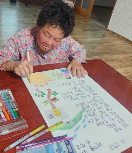 ![]() 보성군 조성면 수촌마을 어르신 3명, 2025년 성인문해교육 시화전 수상_성인문해교실에서 손정남 어르신이 출품작 준비를 하고 있다 |