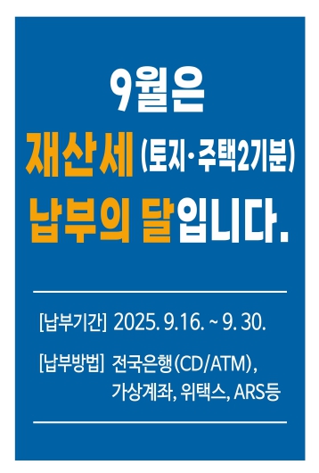 이번에 부과된 재산세는 토지분 7만 6437건에 198억 원, 주택 2기분은 5531건에 17억 원이며 납부 기한은 오는 9월 30일까지다.