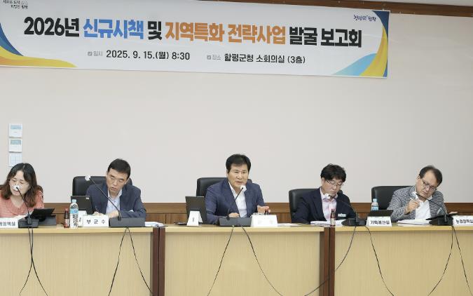 함평군은 16일 “2026년 신규시책 및 지역특화 전략사업 발굴 보고회가 지난 15일 함평군청 소회의실에서 개최됐다”고 밝혔다. 회의는 이상익 함평군수가 주재하고 강하춘 부군수와 각 실과소장, 읍면장이 참석했다.
