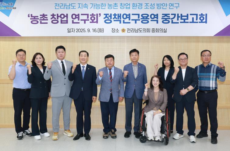 이날 보고회에는 ‘농촌 창업 연구회’ 모정환 대표의원(더불어민주당, 함평)을 비롯해 이광일 의원(더불어민주당, 여수1), 김문수 의원(더불어민주당, 신안1), 신의준 의원(더불어민주당, 완도2), 박종원 의원(더불어민주당, 담양1), 김미경 의원(정의당, 비례), 박형대 의원(진보당, 장흥1), 김주웅 의원(더불어민주당, 비례) 등 연구회 소속 의원 8명과 연구용역 수행기관 연구진, 전라남도 농축산식품국 관계 공무원도 자리를 함께했다.