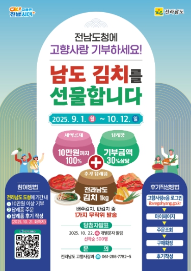 전남도청에 10만 원 이상 기부하고 답례품 후기를 작성한 선착순 500명에게 기존 답례품 외에 시니어클럽 어르신들이 직접 담근 배추김치와 파김치 중 1가지 품목(1kg)을 추가 답례품으로 제공한다.