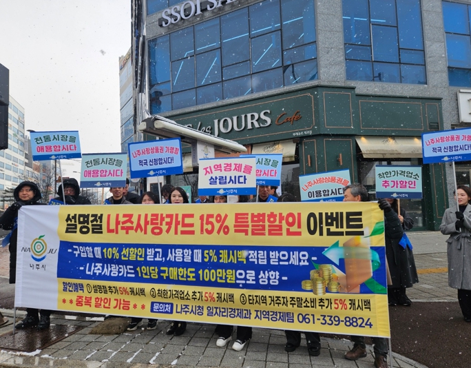 ![]() 나주시가 지역경제 활성화를 위해 10월부터 나주사랑상품권 할인율을 확대 판매한다. 사진은 2025년 설맞이 지역경제 활성화 캠페인 모습. |