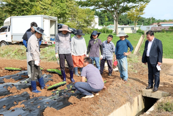 ![]() 7일 진행한 귀농인의 집 배추 정식 실습 교육 중 김산 군수가 방문해 교육생들을 격려했다. |