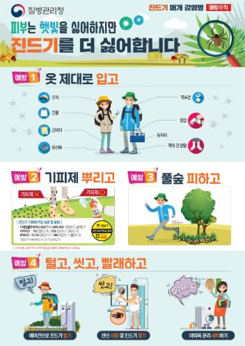 예방수칙으로는 ▲밝은색의 긴소매·긴바지, 양말 착용하기, ▲진드기 기피제 사용하기, ▲야외활동 후 즉시 샤워 및 의복 세탁하기, ▲증상 발생 시 의료기관 방문하여 치료받기 등이 있다.