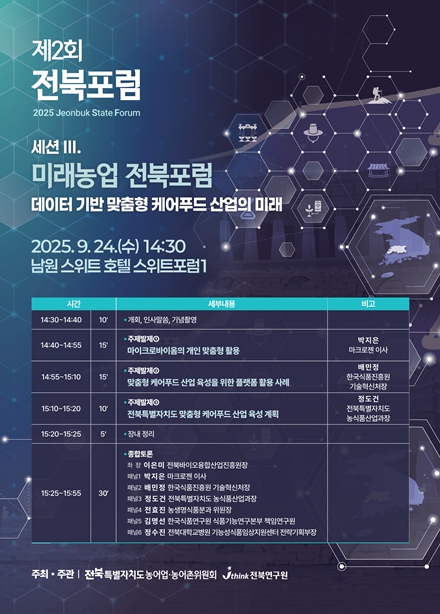 민선식 전북자치도 농생명축산산업국장은 "이번 포럼을 통해 전북이 보유한 세계 수준의 마이크로바이옴 자원과 농생명 인프라를 기반으로, 케어푸드 산업의 미래 청사진과 구체적 실행 방안을 논의하는 뜻깊은 자리가 될 것"이라며 "체계적인 기업지원과 과학적 데이터에 근거한 연구 개발로 전북을 대한민국 맞춤형 케어푸드 산업의 중심지로 발전시켜 나가겠다"고 말했다.