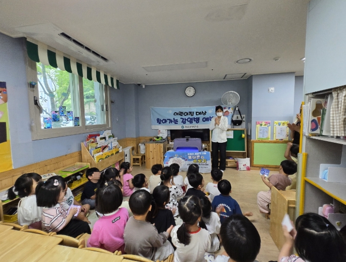 ![]() 화순군보건소 관계자가 어린이집 영유아를 대상으로 감염병 예방 교육을 하는 모습 |